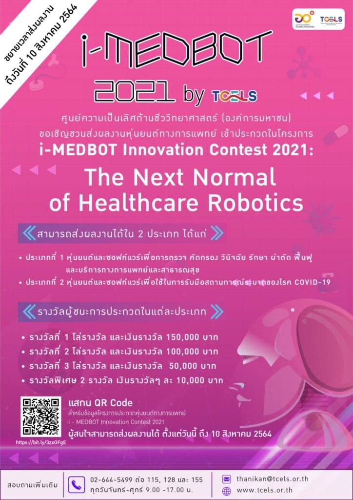 ศูนย์ความเป็นเลิศด้านชีววิทยาศาสตร์ (องค์การมหาชน) หรือ ทีเซลส์ (TCELS) กระทรวงการอุดมศึกษา วิทยาศาสตร์ วิจัยและนวัตกรรม ขยายเวลา!!! ส่งผลงานหุ่นยนต์ทางการแพทย์ เข้าประกวดในโครงการ i-MEDBOT Innovation Contest 2021 ถึง วันที่ 10 สิงหาคม 2564 เชิญชวนผู้สนใจร่วมนำเสนอผลงานสร้างสรรค์ที่ประยุกต์ใช้เทคโนโลยีและนวัตกรรมที่เกี่ยวข้องกับหุ่นยนต์และระบบอัตโนมัติ มาสร้างเสริม พัฒนา ป้องกัน และแก้ปัญหาสุขภาพ ยกระดับคุณภาพชีวิตของคนไทย พร้อมตอบโจทย์การแพทย์และสุขภาพในยุค Next Norma l ภายใต้แนวคิด The Next Normal for Health Care Robotics โดยแบ่งการประกวดออกเป็น 2 ประเภท ได้แก่