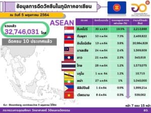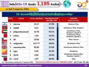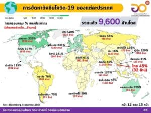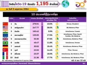 6. ไทย จำนวน 1,573,075 โดส (1.2% ของประชากร) ฉีดวัคซีนของ Sinovac และ AstraZeneca